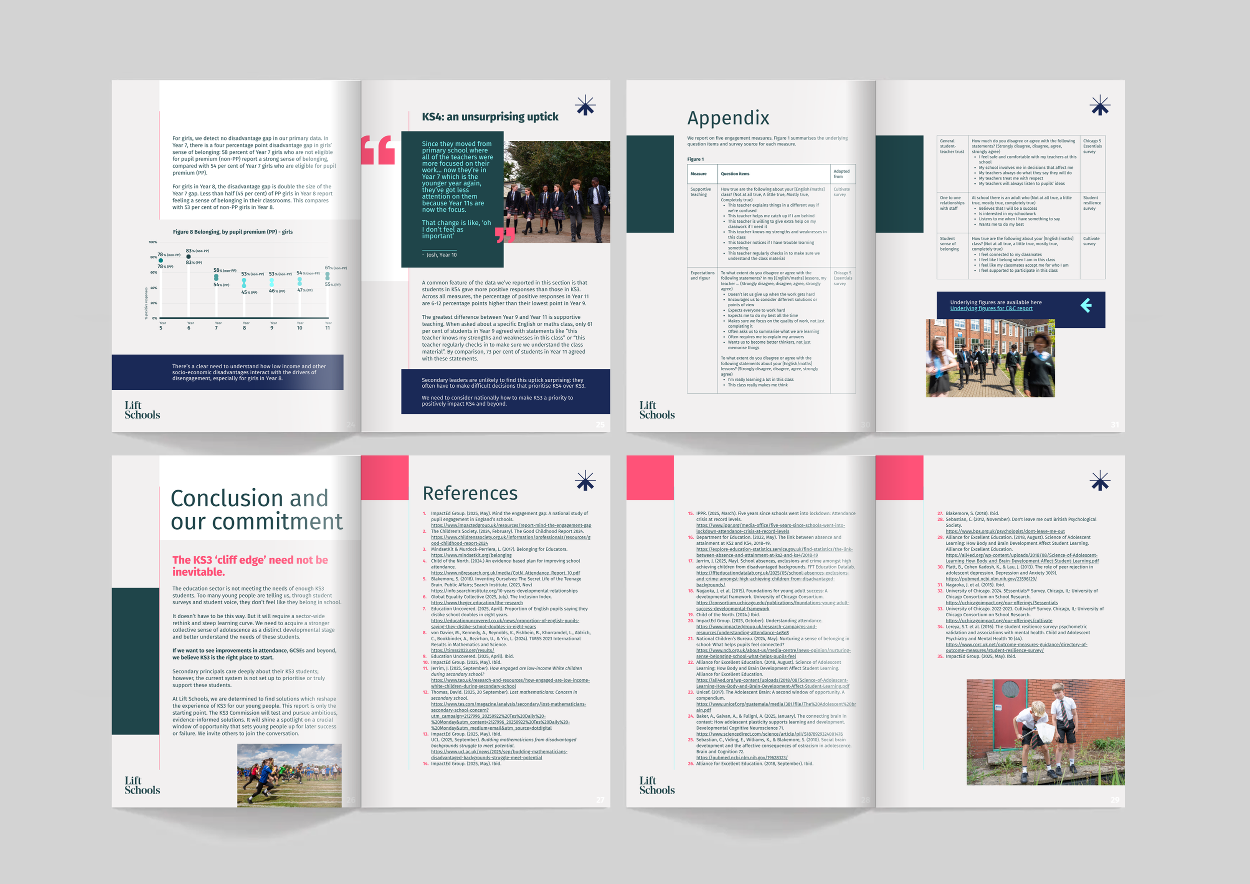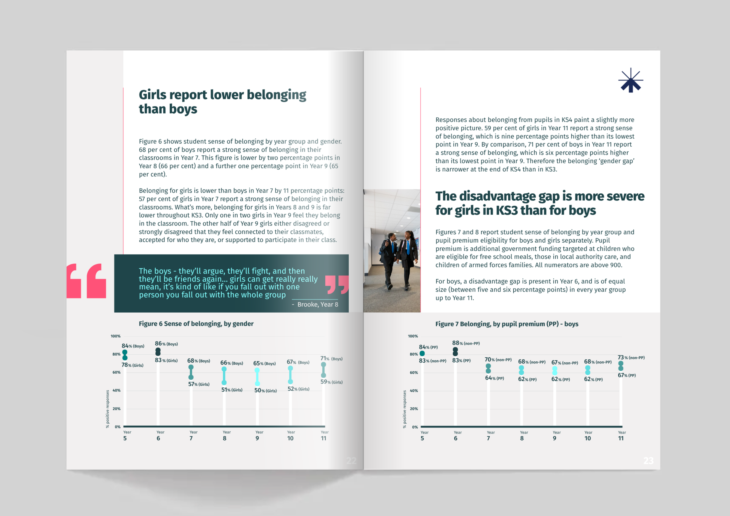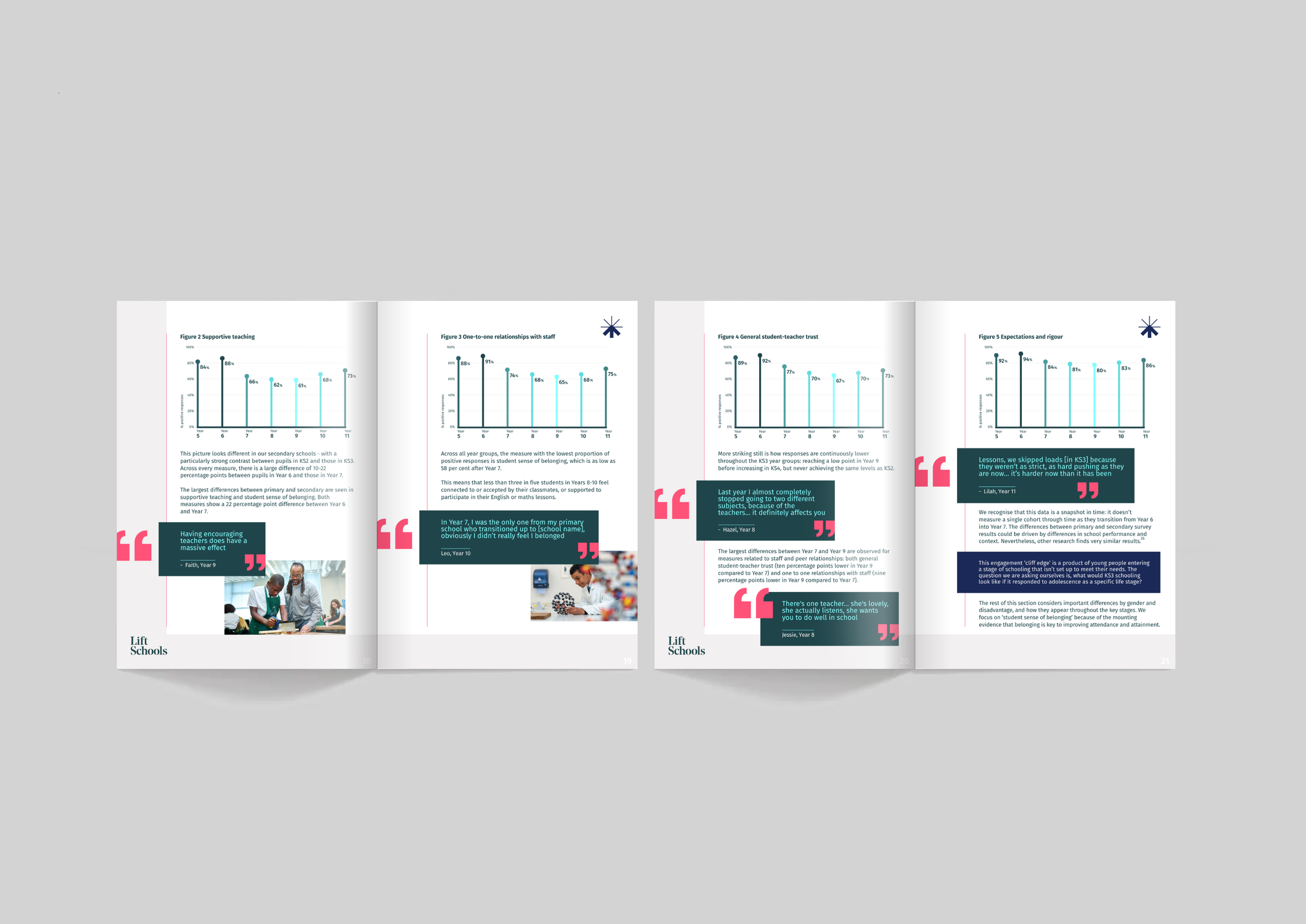 The Solution: It was important to highlight the ‘cliff edge’ drop which happens at KS3. I experimented with several ways to visualise the data, and landed on using the brightest of the brand colours to draw the eye to this foremost. The following report design embraces this further to bring attention to student voices, inviting a wider audience of readers to start sector-wide conversations..
