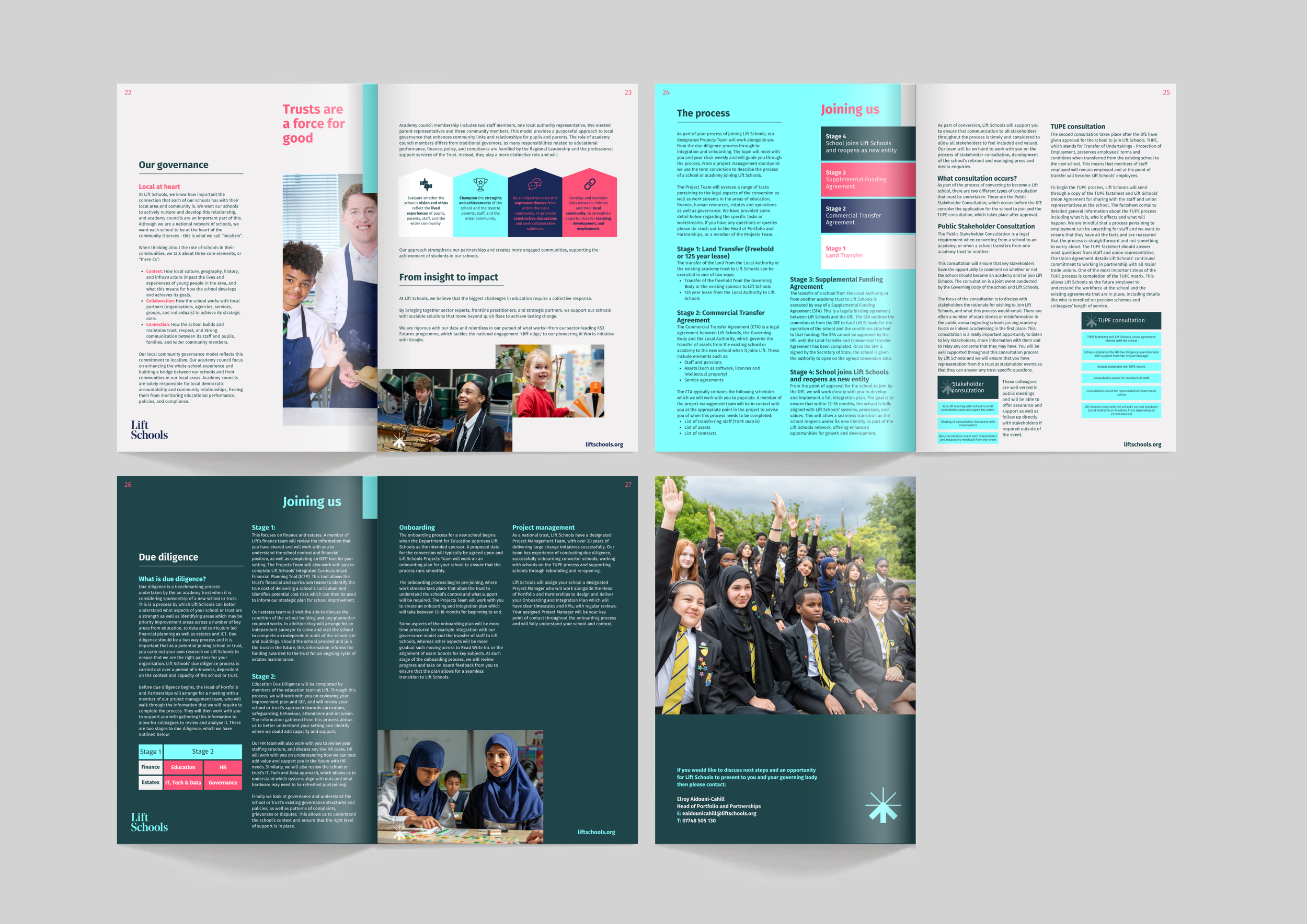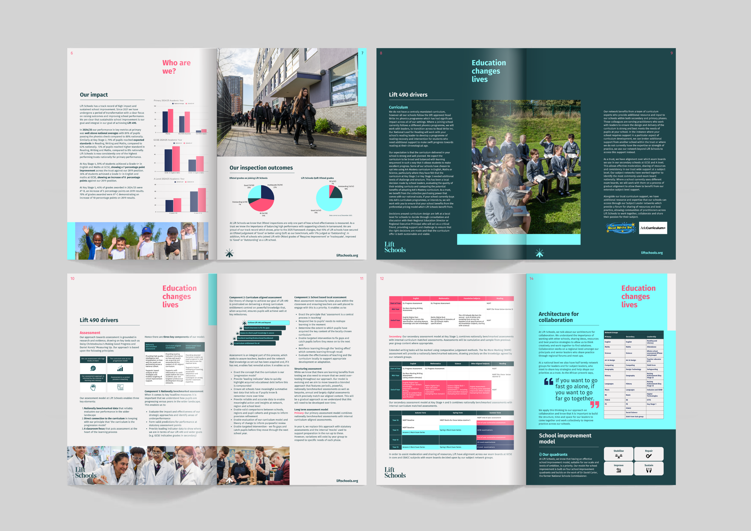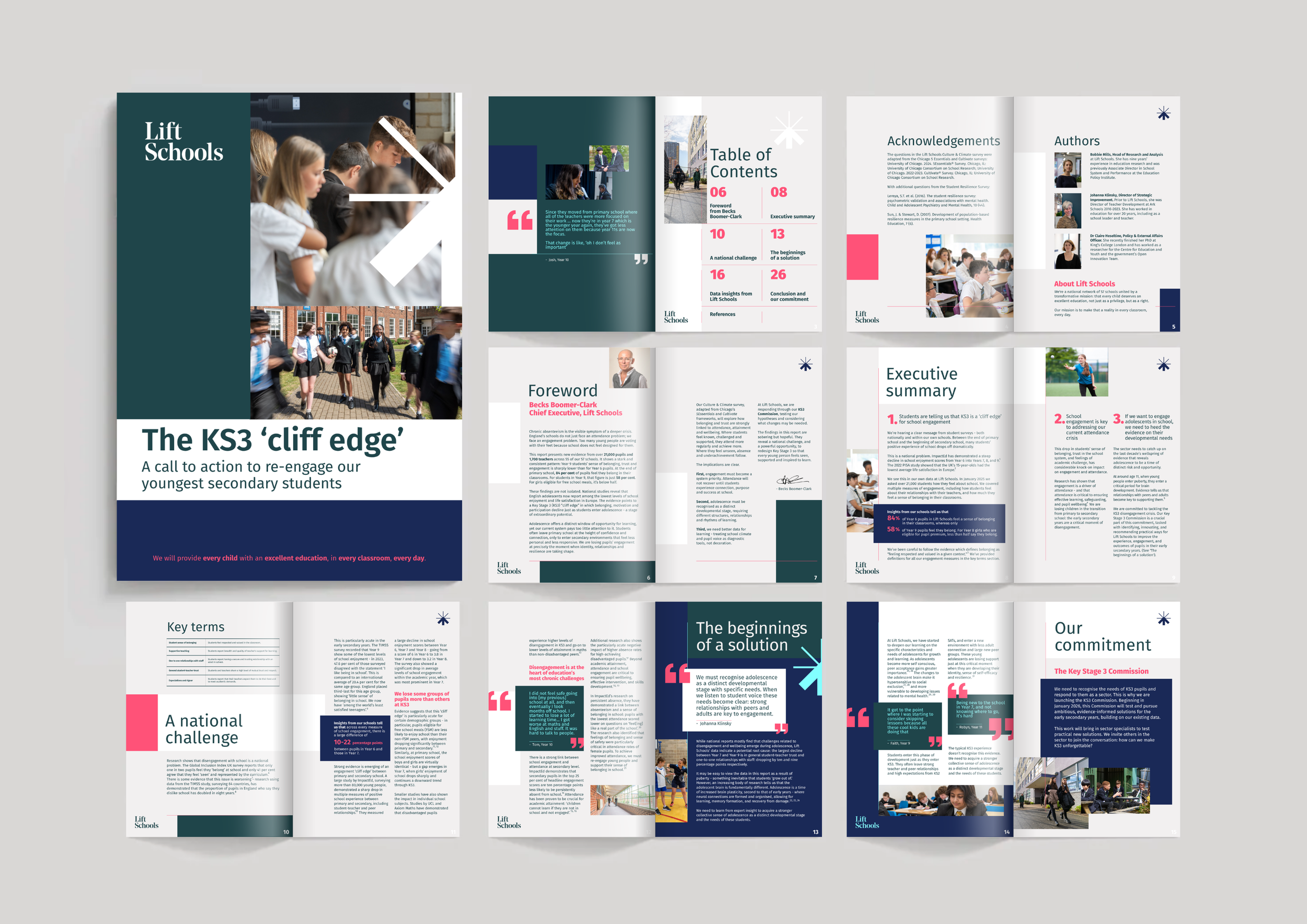The Solution: It was important to highlight the ‘cliff edge’ drop which happens at KS3. I experimented with several ways to visualise the data, and landed on using the brightest of the brand colours to draw the eye to this foremost. The following report design embraces this further to bring attention to student voices, inviting a wider audience of readers to start sector-wide conversations..