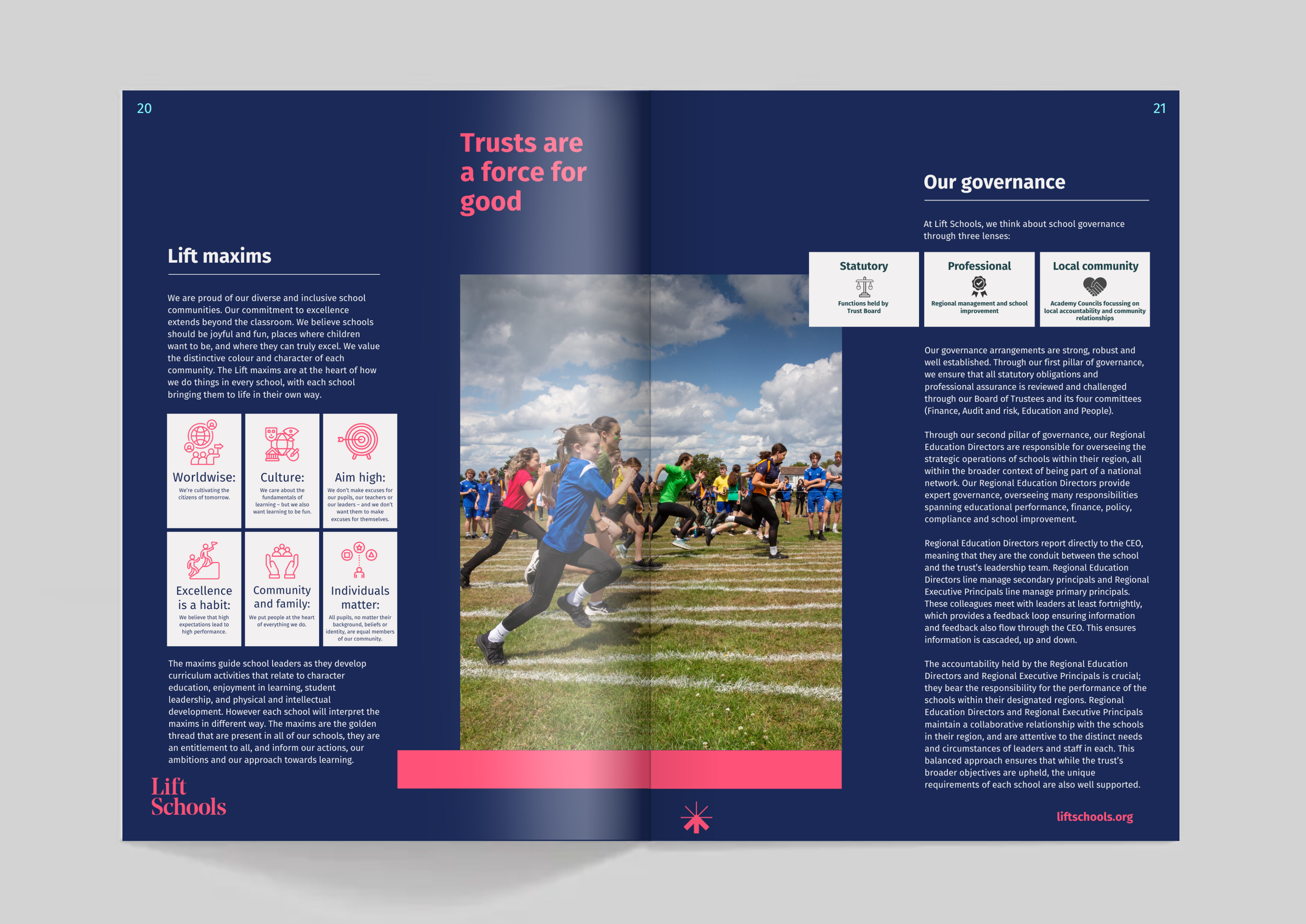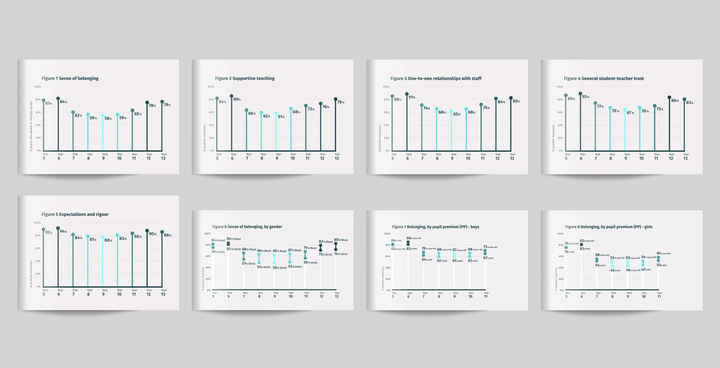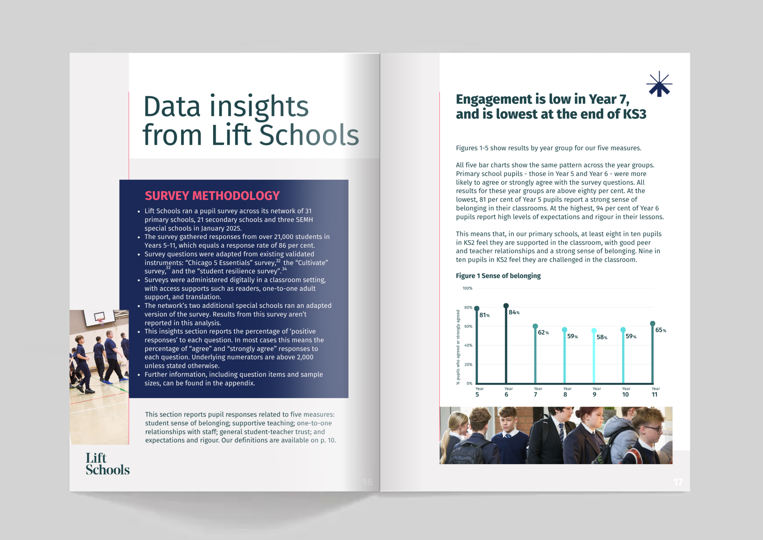 The Challenge: Lift Schools piloted the Culture and Climate Survey and rolled it out to 57 schools across England, including their special schools. Participation was strong, with 96% of teachers (around 1,700) and 86% of pupils (22,000) in Years 5 to 13 taking part. The results indicated a staggering Key Stage 3 drop which needed to be reported in a formal but engaging-grabbing way.