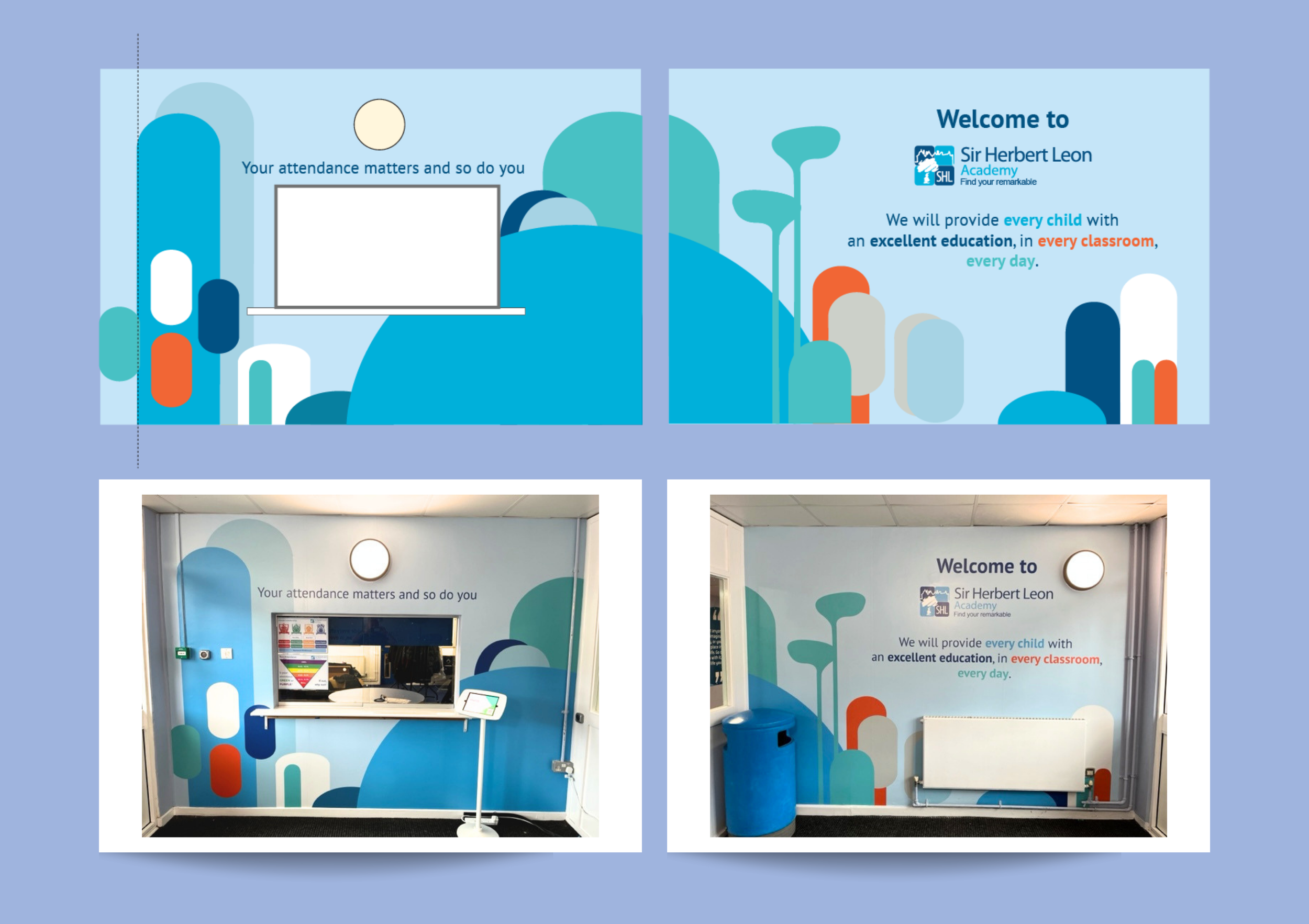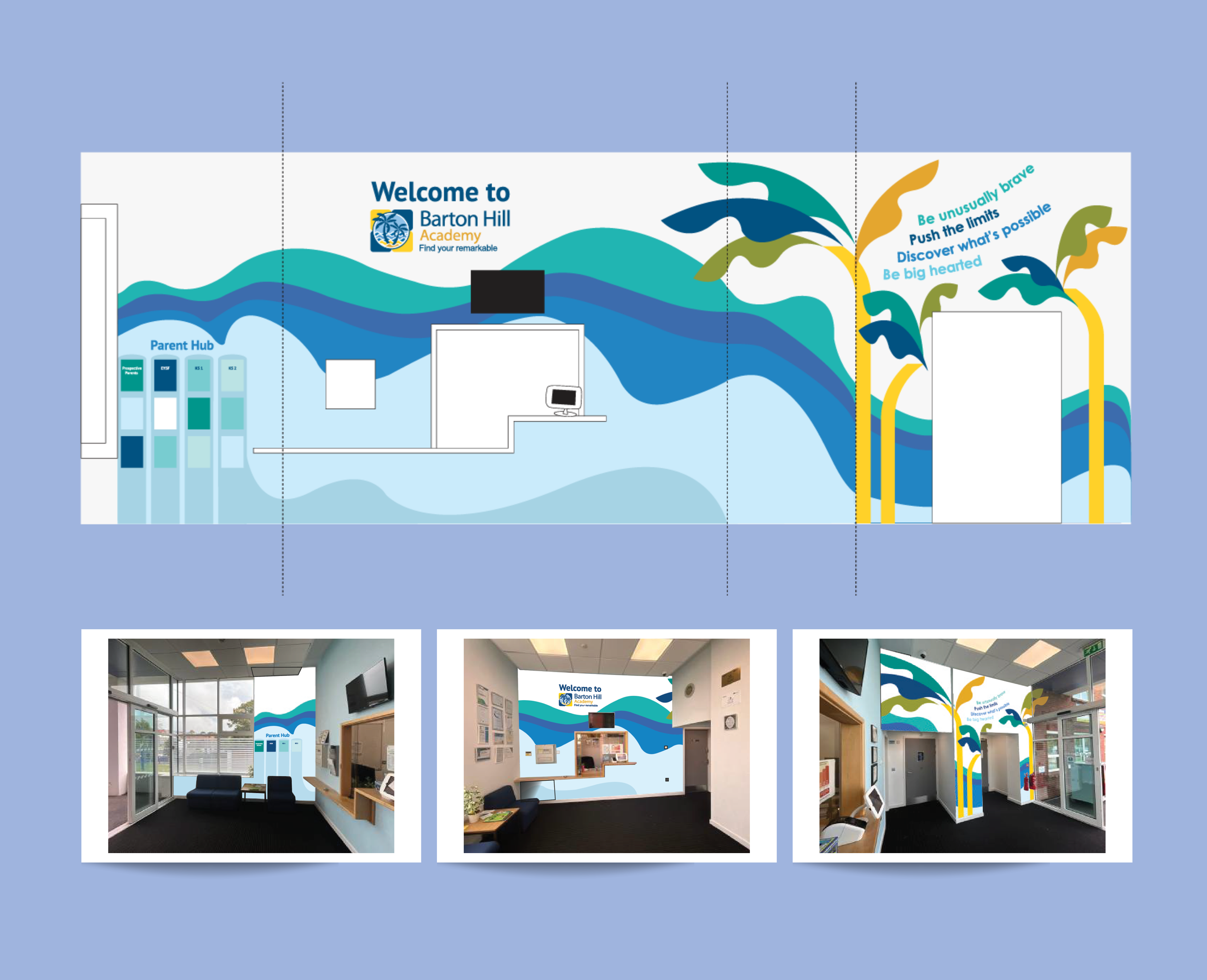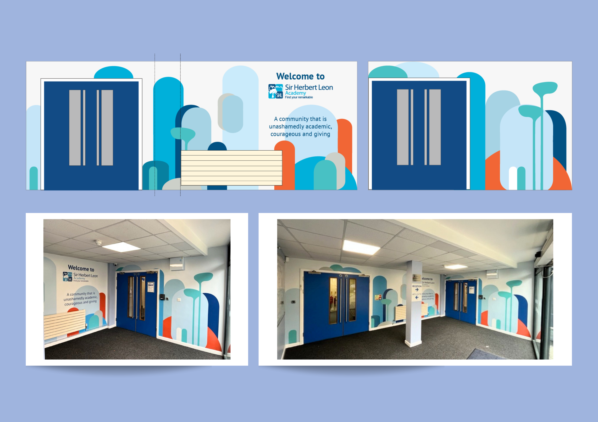 The Challenge: School estates can sometimes look old and uninspiring, affecting the students, staff, and carers that step foot there. When trying to change student outcomes, school culture plays a huge part. I needed to create a design that inspires and uplifts busy areas. Space can be narrow and dark, budgets are minimal, so design must factor aging well.