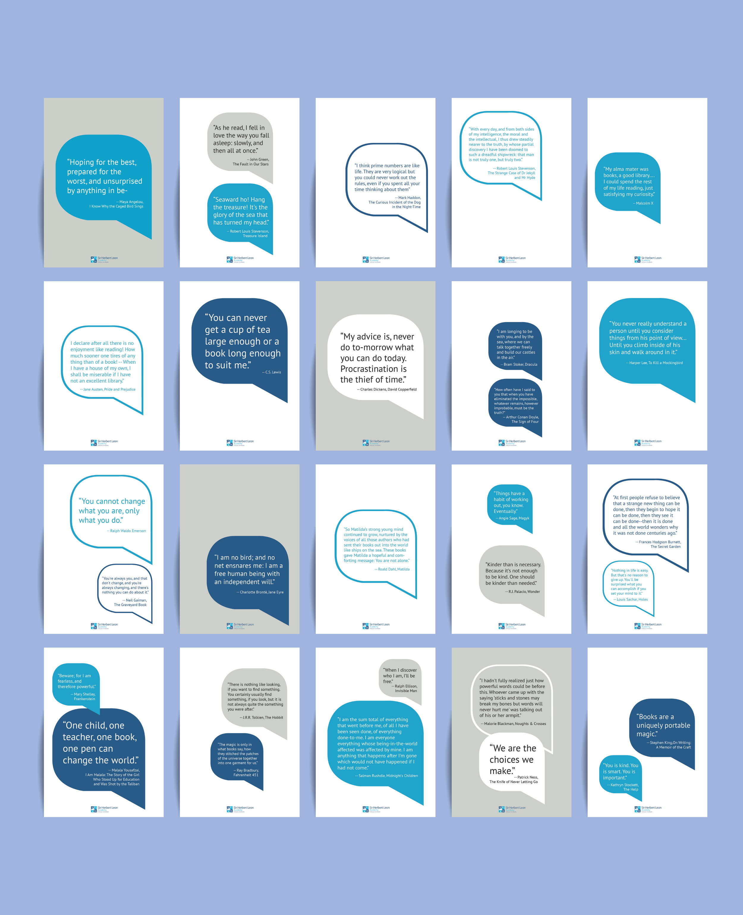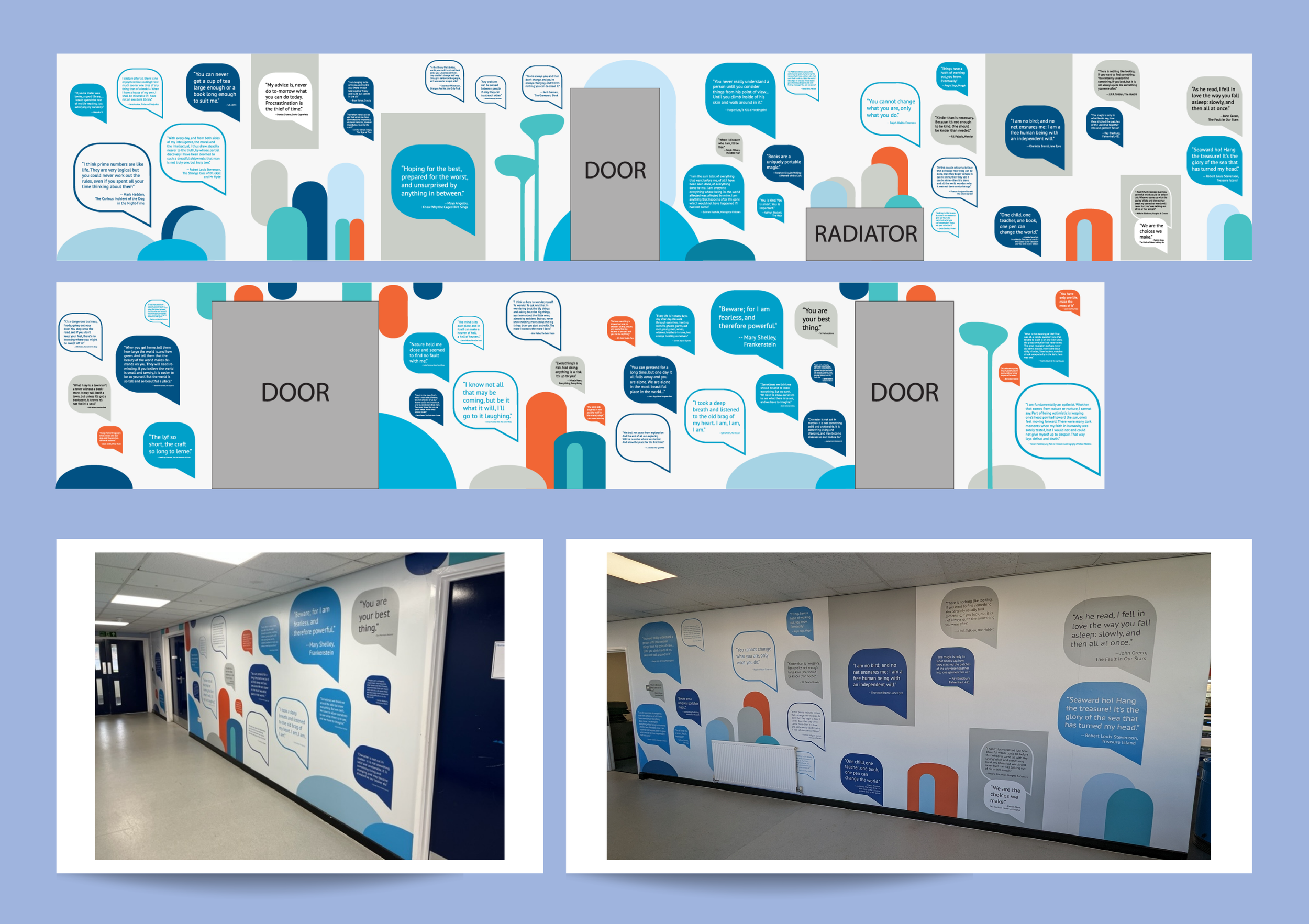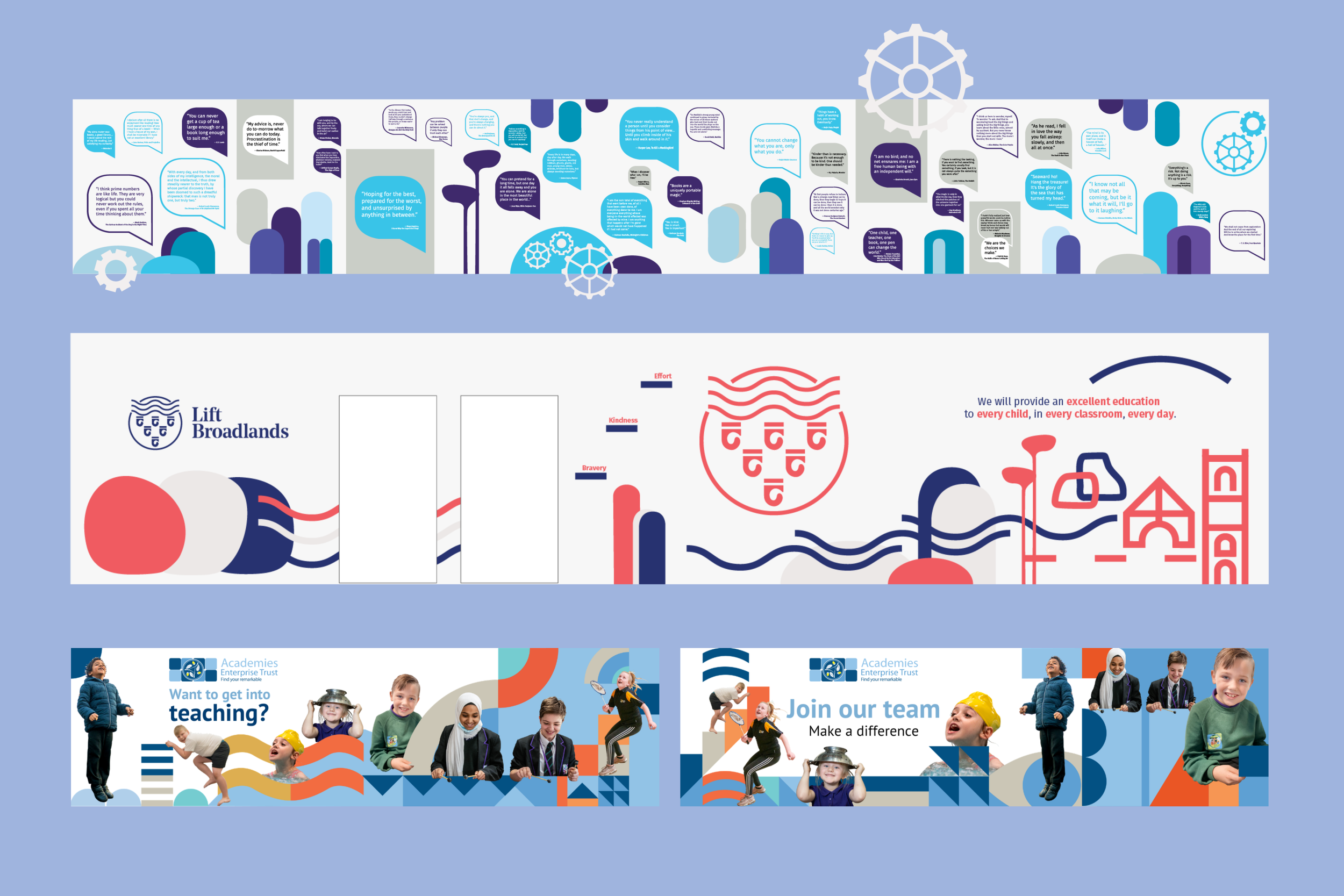 The Solution: Working with school leadership, I chose to highlight thoughtful quotes from their reading cannons into the design. Using clean, bright and simple shapes to invite the reader’s curiosity, and blow up text as the hero not to miss, design contributes to a stronger renewed culture of learning and an environment where people feel proud and happy to come to.
